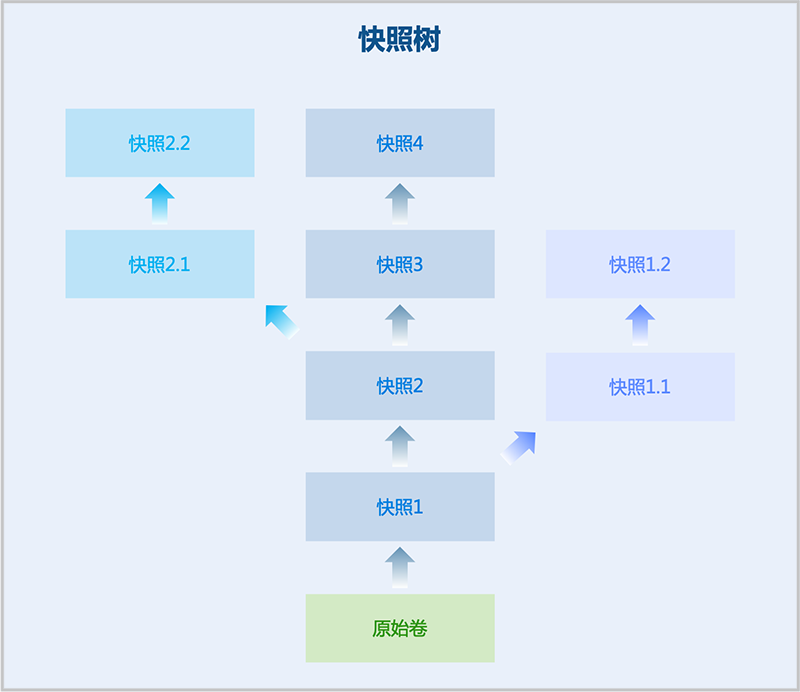 通常一块磁盘对应一条快照链,支持对一块磁盘创建一棵快照树,快照树的每一个分支都是一条快照链。