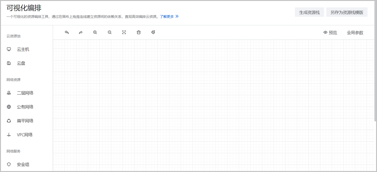 使用可视化编排,可以更直观高效地创建资源栈模板以及显示资源栈结构。打开可视化编排,通过拖曳资源到画布中适当位置,连线创建资源间的依赖关系,并输入需要的参数,即可快速创建资源栈模板,高效编排云资源。