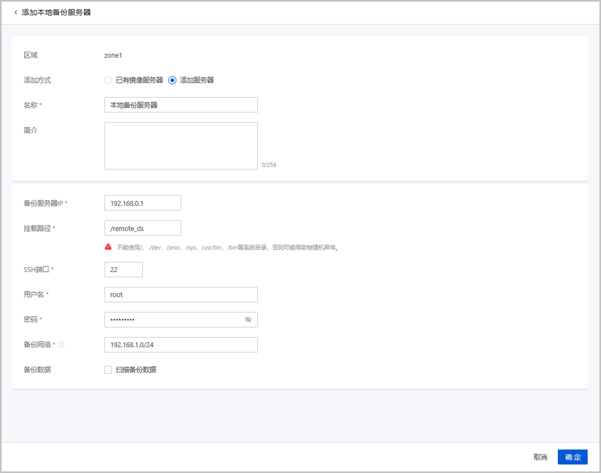 在ZStack Cloud主菜单,点击,进入本地备份服务器界面。点击添加本地备份服务器,弹出添加本地备份服务器界面。