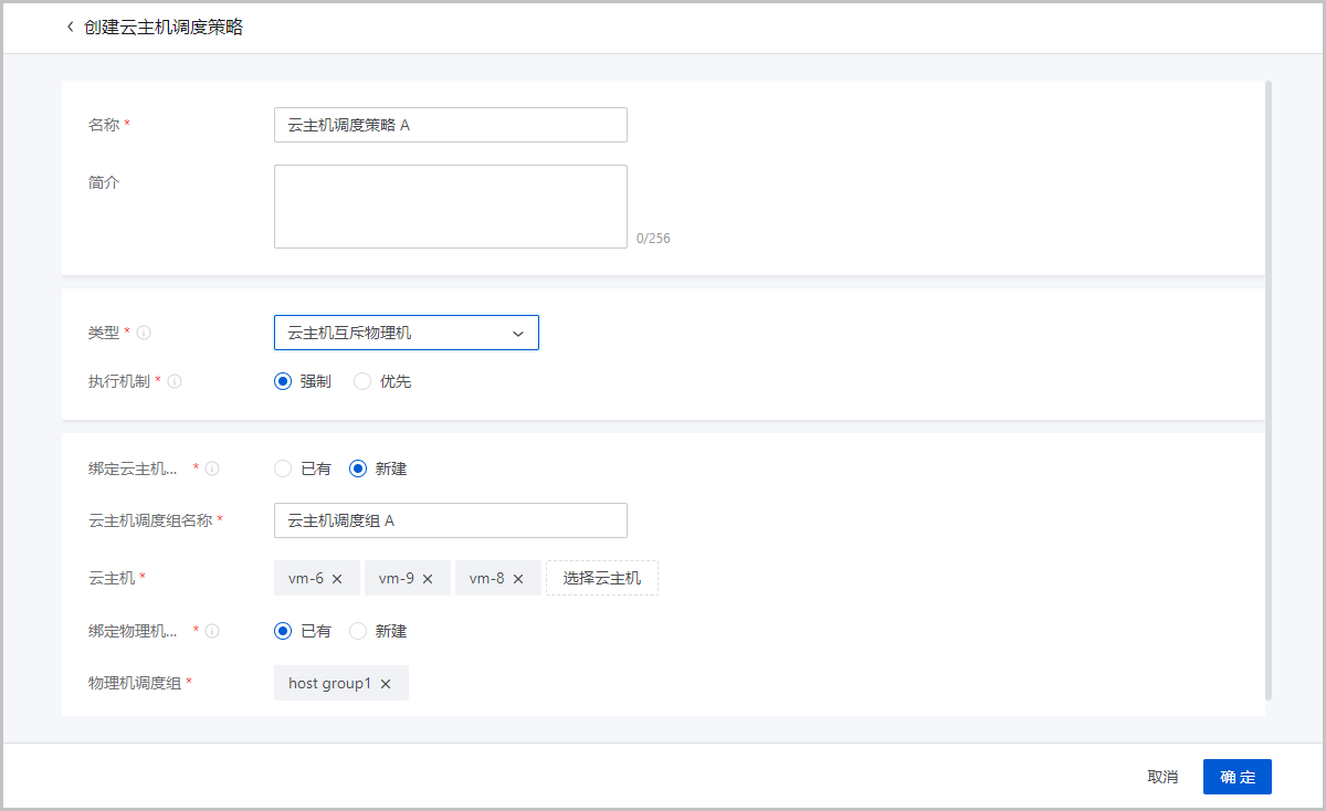 在ZStack Cloud主菜单,点击,进入云主机调度策略界面。点击创建云主机调度策略,弹出创建云主机调度策略界面。
