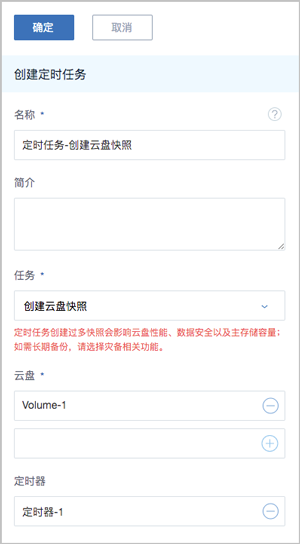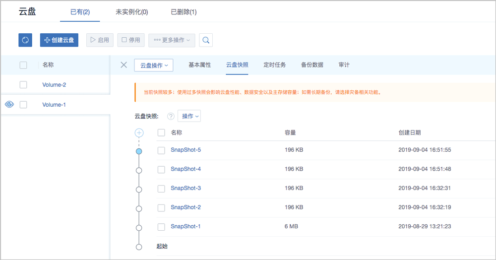 在生产环境中,建议单块磁盘的快照数量尽量控制在5以内,快照过多会影响云主机/云盘的IO性能、数据安全以及主存储容量。不建议进行高频的定时快照备份。如需长期备份,请选择灾备相关功能。