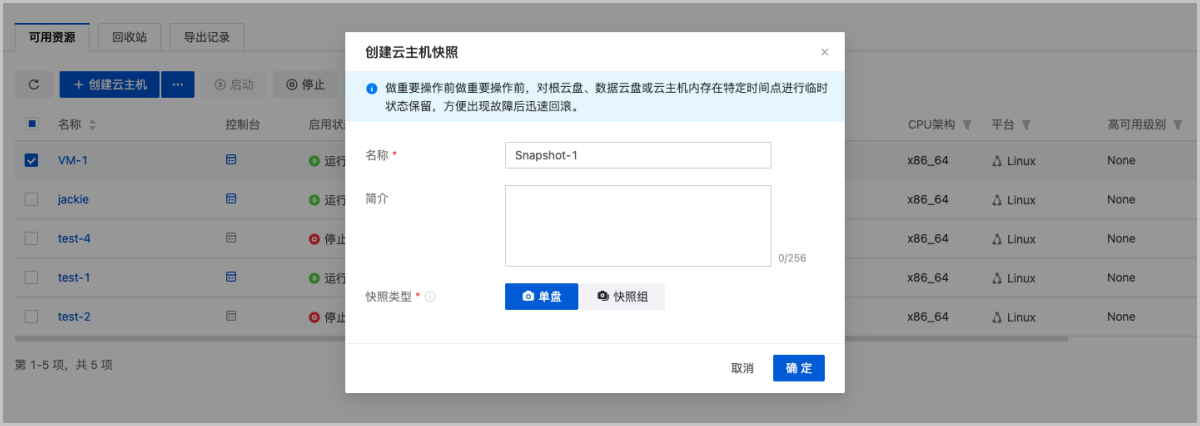 在ZStack Cloud主菜单,点击,进入云主机界面。选择某一云主机(运行中/已暂停/已停止),执行创建快照操作。